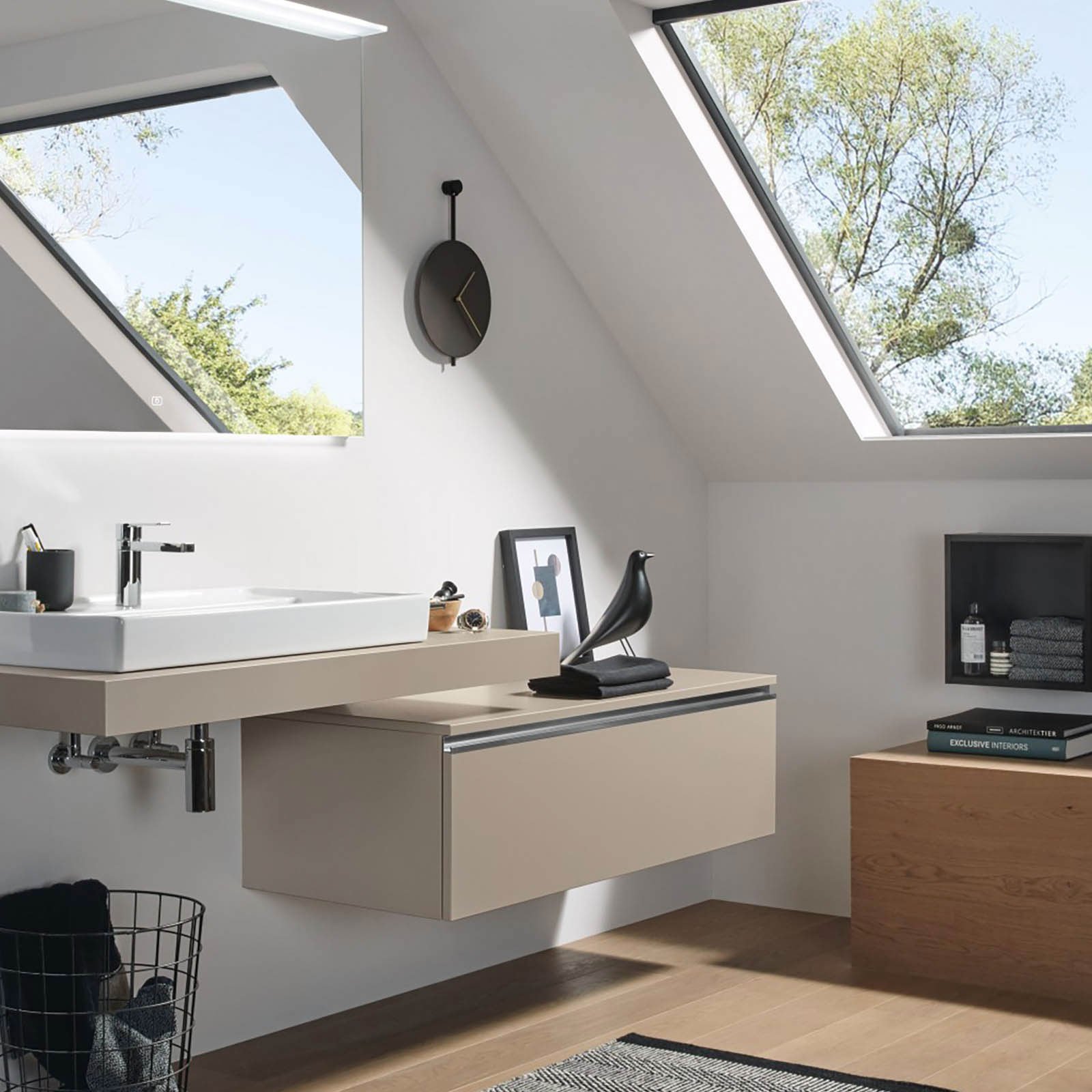 Das geräumige Solitärmöbel in Sandgrau-Matt und die gleichfarbige 2morrow Platte Classic ergänzen sich optimal. Die schwebende, asymmetrische Anordnung sorgt für Stauraum mit großzügigen Ablageflächen und erzeugt dabei eine Leichtigkeit, die durch den Reflection Lichtspiegel LUCA noch unterstützt wird. Zusammen mit platzsparenden Cubes in Kontrastfarbe entsteht eine moderne Badlösung.