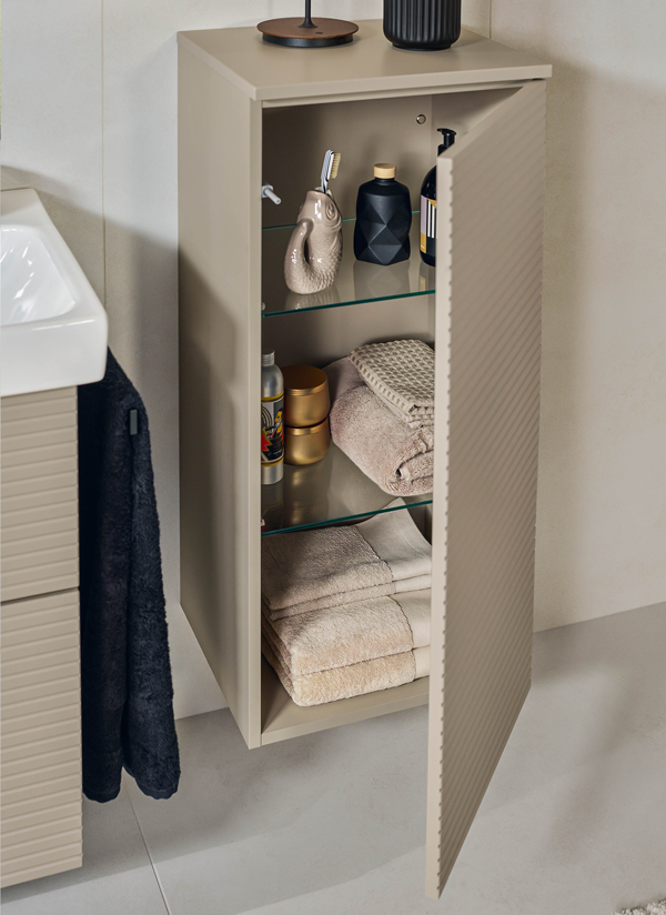 3way-Struktur Badmöbel sind in sechs Farben erhältlich. Ausgefallen schönes Ausführungsdetail: die Möbelfronten mit ihrer strukturierten Oberfläche. Der Möbelkorpus ist dabei immer gleichfarbig und glatt. Zur Wahl stehen authentische Eichenholzoberflächen, die eine ausgesprochen natürliche, je nach Ton warme oder modern-reduzierte Atmosphäre im Bad erzeugen. Die hochwertigen Matt-Oberflächen passen sowohl in ein urbanpuristisches als auch in ein klassisch-elegantes Ambiente während die elegante Oberfläche in Weiß-Glanz eine optische Tiefe vermittelt und selbst kleine Bäder groß wirken.